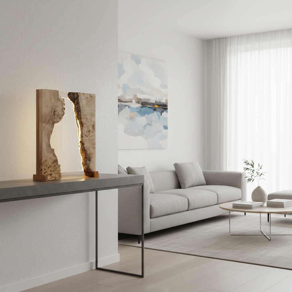 A softly diffused glow emanates through the frosted glass, enhanced by integrated LED lighting. This gentle illumination highlights the natural grain and live edges of the timber, creating a warm and atmospheric presence within any space.